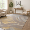 The Flow Motion Rug features dynamic wave patterns in soft, muted tones, creating a modern and artistic statement. Perfect for contemporary spaces seeking movement and style.