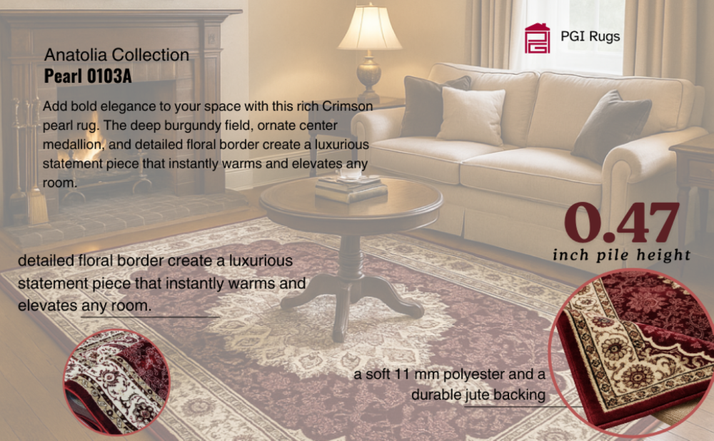 Vacuum regularly. Clean spills immediately with mild soap and water. Allow to dry fully before placing. Professional cleaning is recommended for deep care. Do not dry clean.